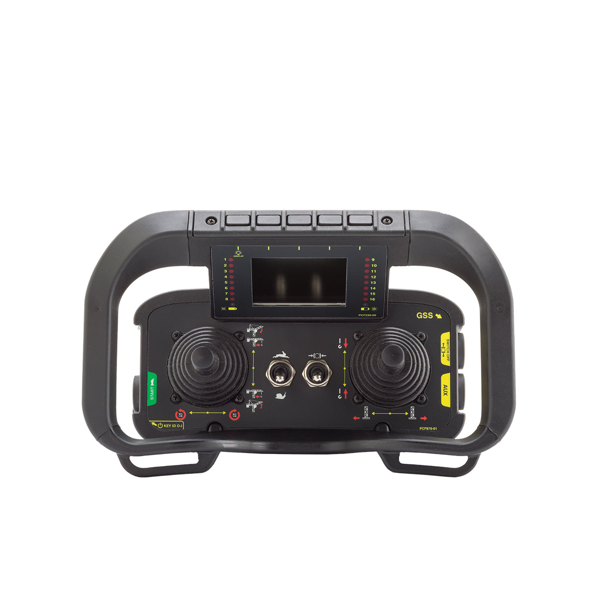 a portable unit for the remote control of machinery in multiple industries. With a highly reliable radio link and compliance to functional safety requirements this "compact" belt and harness transmitter is suited for use in demanding environments. Studied with an ergonomic shape to prevent involuntary activations and issues due to external interference during operation, its functional-area is optimized for a comfortable and easy access/grip of the actuators on top and sides. The top-frame integrate comfortable rubber handles and a TFT 2.8" color display. In all configurations mechanical and chemical resistance is granted as well as IP65 and 1.5 m fall.